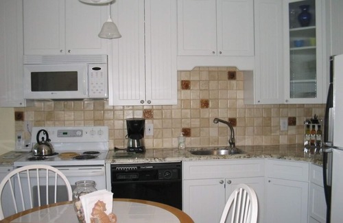 This condo offers a beautiful kitchen, a very tastefully designed bathroom plus an extra sink and vanity in the dressing area . There' s plenty of seating in the living room and kitchen for you and