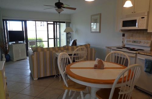 The most relaxing place you could imagine is waiting for you . We love spending time at this resort complex and know you will too. Seaside colors are cheerful and warm. The location of this first floor condo is perfect with the beautiful green of the first tee on the golf course and a fountain as your view. A screened patio is great for the morning coffee or the glass of wine or iced tea in the early evening. Just steps beyond the patio is a new resort-style pool and kiddie pool.