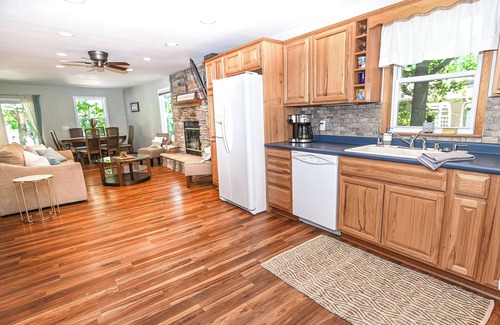 When you enter this air-conditioned abode, you will find a welcoming living room with a gorgeous stone electric fireplace and a smart TV with streaming services - the perfect place for family gatherings! Curl up on the sofa and watch a favorite movie or show while the electric fireplace keeps you nice and toasty. There is a second and smaller living area with a comfy sofa and plenty of board games and books for you to enjoy. The open kitchen is fully equipped with everything you need to whip up savory meals and snacks for the group, including a double-door fridge, stove, oven, microwave, dishwasher, and coffee maker.