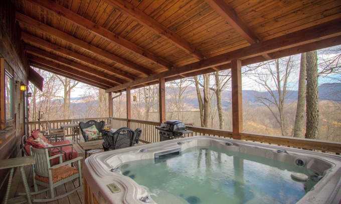 Perfectly furnished, Hot Tub, Views, and immaculate! All the amenities of home and more. Incredibly decorated throughout, stone fireplace, dining table, eat-in kitchen, and comfy furnishings. The bedrooms are so cozy, and you will not want to leave. When you walk in the door, you are immediately pulled to the view that stretches across the horizon. The covered porch has a table and a gas grill. Private balcony off the upstairs bedroom with long-range views. Spacious covered back porch with hot tub and seating for enjoying the mountain setting.