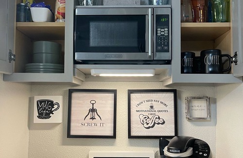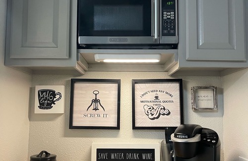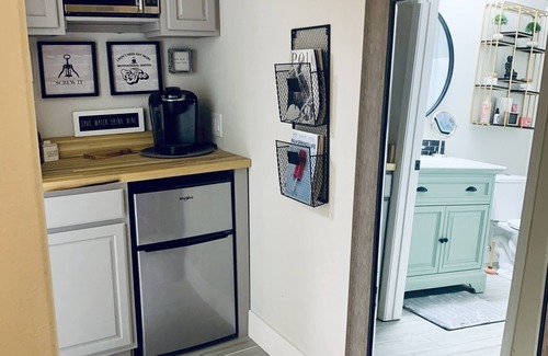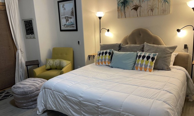 Escape to the Desert, but feel right at home in this updated Private Casita in a quiet safe neighborhood. Enter through your own private entrance and enjoy all the great features of this space, including a brand new memory foam king size bed, a fully redone mini kitchenette, and cool Mid-Century Modern vibe.