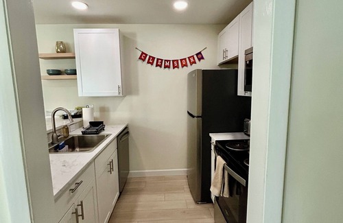 The open-concept dining, living, and kitchen area creates a warm and inviting space perfect for relaxing or gathering, complete with a 65” smart TV. This single-floor condo features three bedrooms, each with a queen-size bed, premium linens, and bamboo pillows, ensuring a restful stay. Two full bathrooms and a spacious laundry room add to the home’s convenience. The fully equipped kitchen has everything you need to prepare and enjoy meals at home. Guests have full access to the space, except for the locked hallway closets.