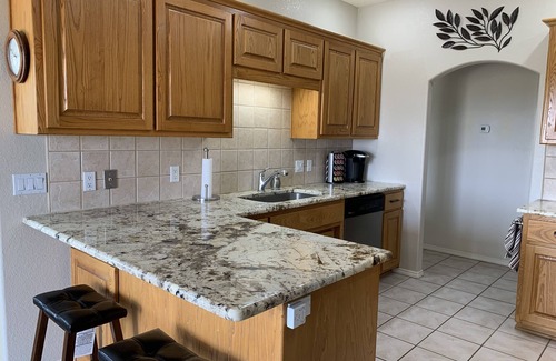 Enjoy the ease and convenience of this 3 bedroom 2 bath home that is located just minutes from Elephant Butte Lake. The backyard includes a private and spacious patio with picturesque views of the mountains. After a day at the lake you can enjoy grilling up a sunset dinner in the outdoor kitchen or sipping on a cold drink on the patio. The large driveway area provides plenty of parking for all your toys. (A 30 amp RV hook up is available for an additional charge). Your stay will include free bagged ice and a state park pass.