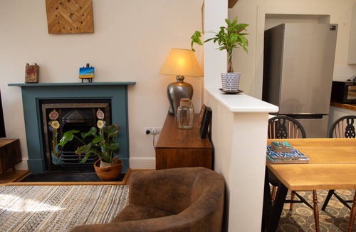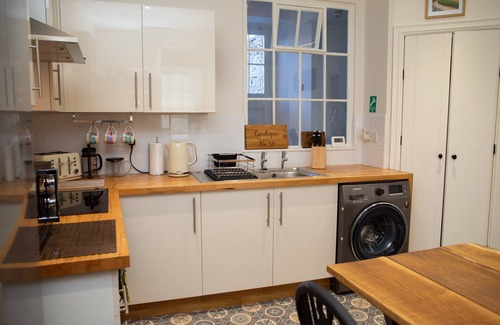 Inside, 36A Cardigan blends contemporary design with period charm, offering warmth and exceptional comfort. The open-plan kitchen, lounge, and dining area create a welcoming space to relax and unwind. The lounge features plush sofas and a Smart TV, perfect for cozy evenings in, while the dining area has a modern picnic-style table for meals together. The well-equipped kitchen includes everything you need for a stress-free stay, with a fridge, freezer, microwave, oven, hob, toaster, kettle, high chair, and a full range of cookware and utensils. For added convenience, laundry facilities include a washing machine, iron, and ironing board.