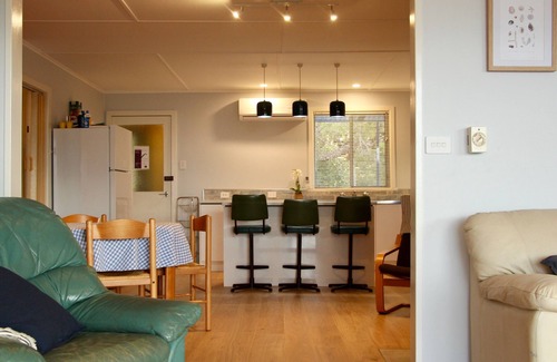 Room to move with living areas, kitchen and bathroom upstairs and downstairs. Five bedrooms, views from both levels, ideal for families and groups to have their own space. Two TVs with video players ( like the olden days), new kitchen upstairs, table tennis in the shed for rainy days, and combustion heater for cosy winter reading! Wireless internet and upstairs bath - ideal for little people. Fenced for dogs with dog bed provided.