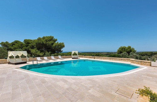 Swimming in the pool with a magnificent sea view on the background, that`s one of the advantages atPerla Bianca. The beautiful villa with pool is refined and truly ideal to spend an amazingvacation near the sea in Puglia, just a few minutes fromthe beach of Ugento and Torre San Giovanni. The luxury villa is surrounded by nature, the plants, ancient olive trees and the mediterranean scrublands. It`s equipped with the most modern accessories and offers accommodation to groups of family and friendsup to 12 people.