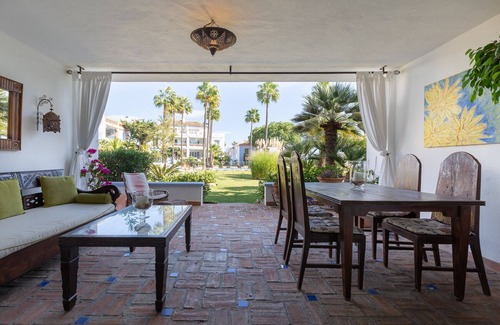 Our apartment is located in the front-line beach luxury complex called La Perla de la Bahía. It is a ground floor with two bedrooms and a marvellous panoramic view of the sea and the beach. It has a private garden. The apartment has been decorated very tastefully and it is located in a quiet area.The bedrooms have double beds and spacious fitted wardrobes with en suite bathrooms. The bright living room has a big sofa and lounge chairs in front of the chimney, a dining table with chairs.The apartment has a spacious and fully fitted wooden kitchen and a utility room. From the sunny terrace you will enjoy the beautiful views of the sea. You can access to the terrace from the bedroom and the living room. In the terrace you will find a table with 4 chairs, a comfortable sofa and 2 sunbeds.The community has four big swimming pools (one is heated), communal gardens, and direct access to the beach.The property is fully air conditioned/heated, it comes with an underground parking space, private WIFI connection and it is located next to 2 beach restaurants and the Finca Cortesín, a 5 stars beach club hotel.