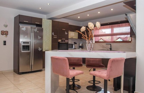 It provides a perfect blend of comfort and luxury for families or groups of friends seeking a relaxing getaway. It features 4 bedrooms, designed for maximum comfort, featuring air-conditioning ( one of the bedrooms is equipped only with a fan), comfortable beds, and plenty of closet space. The 2 bathrooms are well-equipped with modern fixtures, offering convenience for all guests and the WC has a separate toilet for additional convenience, ideal for larger groups or families. There is a luxurious jacuzzi in one of the bathrooms where you can unwind. The fully equipped kitchen, perfect for preparing meals during your stay, includes modern appliances such as a stove, oven, microwave, refrigerator, and dishwasher, as well as cooking utensils, pots, and pans. There is a spacious and stylish living area with comfortable seating, ideal for relaxation or socializing.