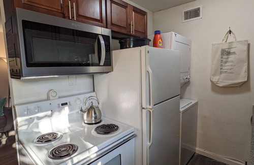 The apartment has everything you'll need, with super fast Fiber wifi, and Roku enabled TV. The large bedroom has a King size bed with memory foam mattress, and the smaller room has a Queen sized bed. The full kitchen has everything you need to cook a meal, and has all appliances; stove, fridge, microwave, dishwasher, washer / dryer.