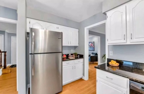 Upstairs, there are three spacious bedrooms thoughtfully designed for comfort. Two rooms feature luxurious king-size beds, custom closets with built-in drawers, smart TVs, and free Wi-Fi. One of these rooms includes a desk and chair, ideal for remote work or study. The third bedroom offers a cozy queen-size bed, a smart TV with free Wi-Fi, and custom built-ins. Completing this level is a full bathroom with a tub, perfect for soaking and unwinding.