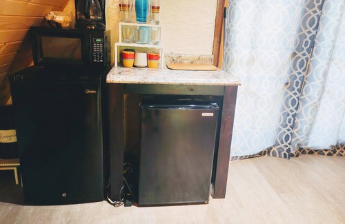 Flatscreen Smart TV with streaming and a DVD Player in Living room, movies provided. Wooden stairs to sleeping loft with 3 safety handles. Stairs can be stowed for more living room space, instructions in the PDF after booking and also in the Cabin Welcome Book on kitchen table.