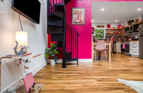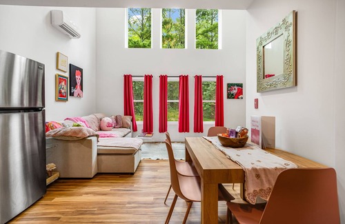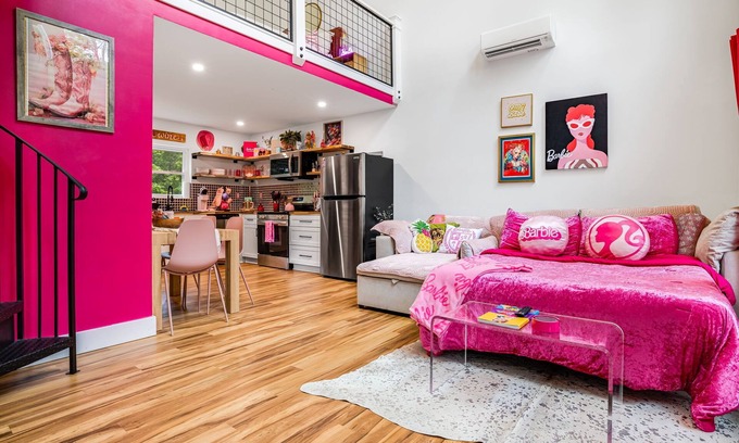 Welcome to our Barbie Palace in Black Mountain—your ticket to living your most sparkly Barbie life! Step into a world of pink perfection, complete with soaring 20-foot ceilings, plush furniture, and decor fit for a true Barbie Dreamhouse. Pamper yourself in our luxe hot tub, unwind in the dreamy soaking tub, and stream all your favorite shows with high-speed Wi-Fi and two Roku TVs.
