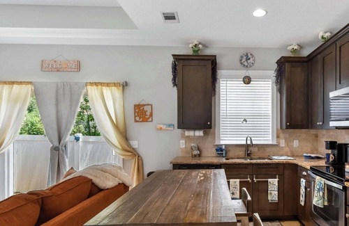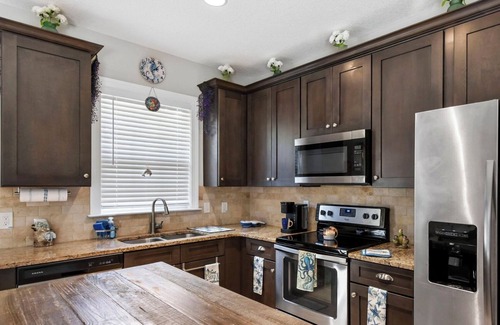 This charming picturesque beach themed cottage has a fenced in backyard perfect for your pups vacation. It host a 55 inch smart TV in the living area and each bedroom has its own Roku TV Granite countertops in the kitchen and vaulted ceilings throughout.