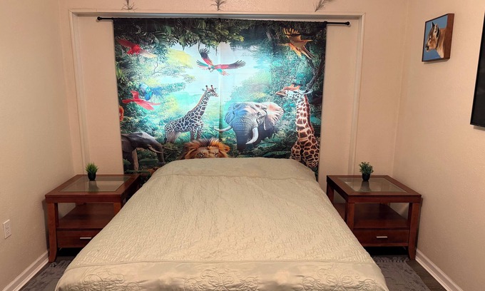 Bedrooms have queen size bed and either closet shelves or a large dresser. The larger room has a recessed floor and animal theme