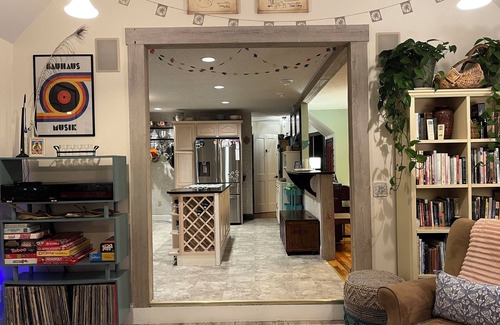 One step down from the kitchen, the large sun filled living room is bright and open, with cathedral ceilings, bluetooth stereo system, record player (with a surprisingly large collection of vintage country albums!), books for adults and kids, board games, and flatscreen TV for streaming (no cable service). Entry to the back deck is from the living room.
