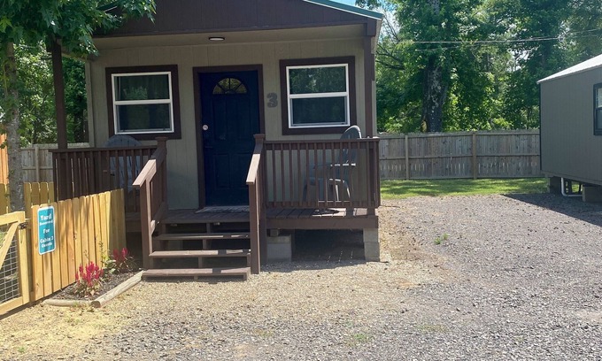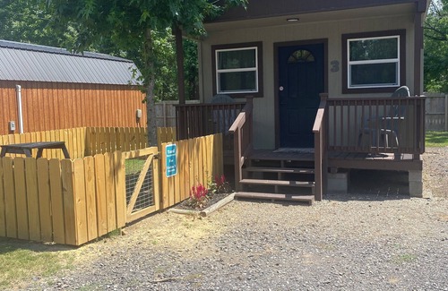This cabin is pet friendly and features a private fenced in yard with shade and a picnic table. Your furry friend will love sitting on the front porch with you while you enjoy your morning coffee. Spoil him with a walk on the paved pathway in the city park next to the cabins.