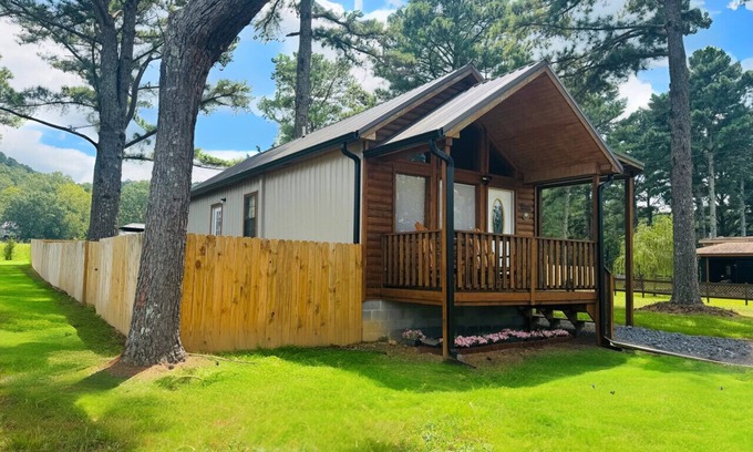 Experience a rustic cabin rental on a spacious, fully fenced pet-friendly property. Perfect for families and friends. The Lake Guntersville vacation rental features a kitchen, living room, open loft space, bedroom, and bathroom with outdoor recreation space.