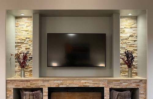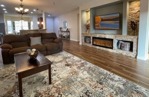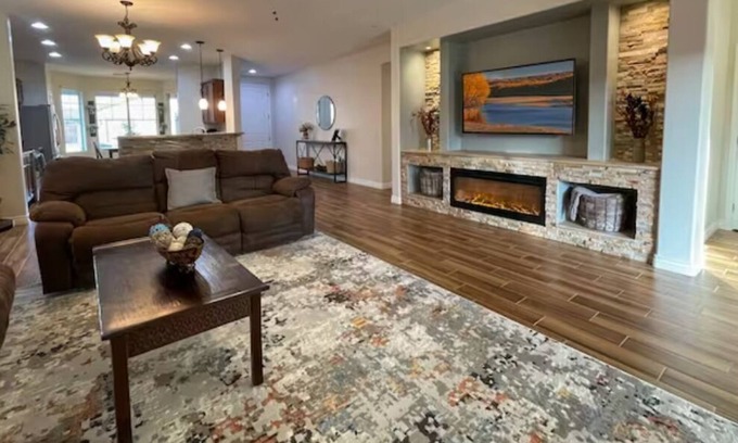 Fully furnished 3 bed/2 bath split floor plan, our home can comfortably sleep 6 people. The master bedroom has a king-sized bed, smart TV, separate shower and tub, double sinks and large walk-in closet. Spare room #1 is our cozy boho styled bedroom with a queen-sized bed and a smart TV. Come cuddle up in spare room #2 that offers a wood accent wall, queen- sized bed and smart TV. The open concept living room has a large couch with plenty of seating, cupholders, recliners, and plenty throw blankets to snuggle up with while watching a movie with the fireplace on. Fully equipped kitchen with a Keurig and air fryer available for use. Large backyard with pavers, turf, a propane BBQ and outdoor wood firepit. We love this home and hope you enjoy it too. Please treat it as if it was your own.