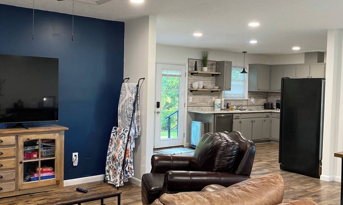 Located just 5 miles from Cumberland State Park, this property welcomes pets and features 3 bedrooms, 2 bathrooms, a full kitchen, and a washer and dryer for your convenience. -Fenced in yard -Kids play gym in the back yard -Netflix- living room, bedroom 2 & 3. -Primary bedroom has an en-suite bathroom. -Fire pit in back yard. -Gas BBQ Grill. -K-cups and drip coffee maker— creamer and coffee provided! -Dining Table seats 6. -TWO outdoor dining areas- on the back porch and creek side. -Laundry with pods provided -We even provide doggy poop bags and treats! Please let me know if you have any questions! Hope you make our home yours for your trip!