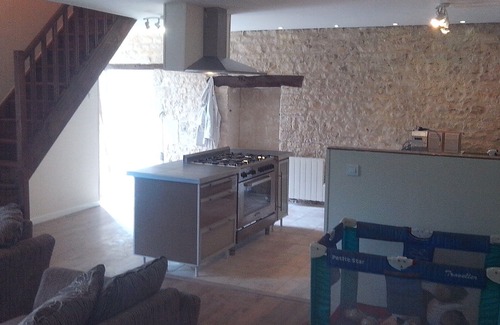 The ground Floor is a large open plan space with a handy store room for luggage, prams or Bicycles. It then leads through into a kitchen area with a central island that contains a Range Cooker for the budding Chefs to cook up French Cuisine sourced from the local Market held in town of Lezay which is the largest Farmers Market in the region.