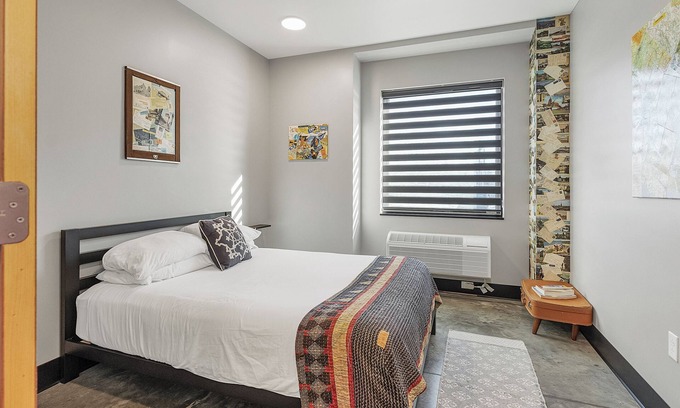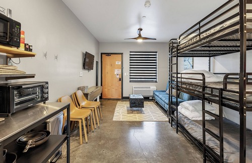 Perfect for couples, friends, or sleepovers, this pet-friendly first-floor suite offers a private queen bedroom, full bathroom, kitchenette, and triple bunk beds in the main area for extra guests. Enjoy the hotel’s community space with a heated pool, ping pong, games, trains, and LEGOs—there’s something for everyone in the family!