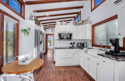The full kitchen is as functional as it is charming, with a farmhouse sink framed by a window with peaceful views, a refrigerator, stove, microwave, and Keurig coffee maker—because no great day of shenanigans should start without coffee!