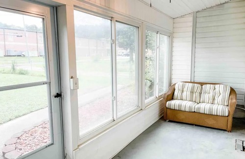 Welcome to our one-level home with an enclosed front porch for private relaxation. The living room features a smart TV for entertainment. Two bedrooms offer queen beds for a comfortable night's sleep. A small den connects the bedrooms, serving as a flexible space with a futon for extra sleeping arrangements and a desk for work. The fully furnished kitchen provides all the essentials for cooking and dining. Our space is a cozy blend of comfort and functionality, ensuring a pleasant stay for guests.