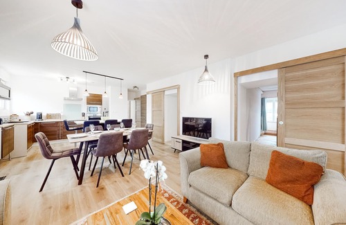 Be surprised by the successful blend of rustic charm and modern amenities that greet you in the open-plan living area of this charming holiday home dating back to 1900. Enjoy game nights on the cosy sofas in front of the fireplace or prepare your favourite dishes in the spacious kitchen and dine in convivial company at the large dining table.