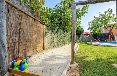 The vacation house is located on a hill in the small village of Marseti with a beautiful view of the countryside. It is a semi-detached house with stone walls typical of the country, but in a modern style and with a beautiful garden area. Next to the terrace you look at the swimming pool. For children there is a play area with swing. Relax on the covered terrace next to it. Two bedrooms are separated and have an extra entrance into the house. In this vacation home you will enjoy your privacy, the pool and the garden in peace. Shared with CIC157 is the lawn, which has two soccer goals and a volleyball net. The neighboring vacation property CIC157 can be booked together with CIL929 and is the perfect choice for larger groups.