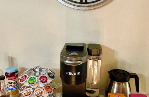 Keurig and drip coffee pot with complimentary K-cups, a variety of tea, coffee creamer and flavors, and a basket of snacks for your enjoyment.