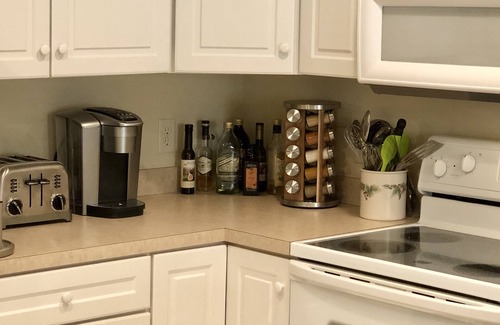 --Kitchen amply stocked with a huge variety of cookware, dishes, and appliances (blender, toaster, Keurig machine, drip coffee maker/gold tone reusable filter, electric kettle, digital measuring scale, slow cooker, vacuum sealer, immersion blender microwave).