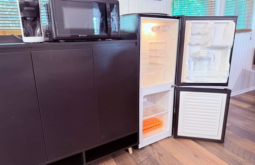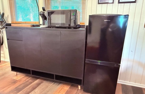 - Compact kitchenette setup with refrigerator, microwave, coffee/tea facilities, and prep space for light meals