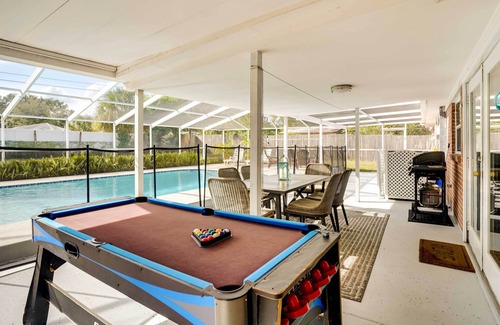 OUTDOOR LIVING: Furnished lanai, pool/air hockey table, renovated private pool (not heated), pool towels, lounge chairs, private yard