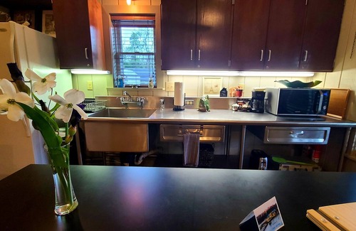 Inside is a comfortable living room area with a wood-burning stove, a big-screen TV, and a pull-out queen-size sofa bed. The kitchen is equipped with a gas stove with an oven, refrigerator, and everything needed to cook a full meal. The spare bedroom includes a newly added twin/full bunk bed and a big-screen TV. The newly updated master bedroom has a king-size bed, a big-screen TV, and a private main bathroom with closet space.