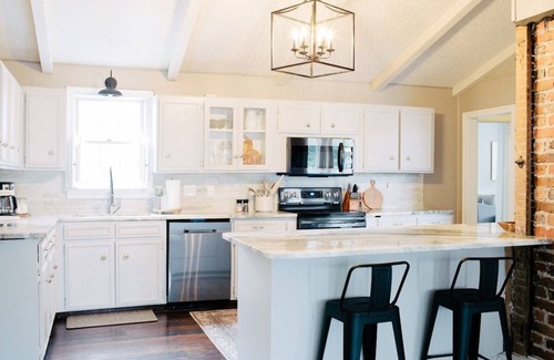 The kitchen and bathrooms in the main house feature luxurious granite counters and stainless steel appliances, blending modern convenience with historic charm. Prepare delicious meals for your group in the well-equipped kitchen, and gather around the large dining room table that can comfortably seat 12 guests. The main house also includes a kids' playroom, ensuring the little ones are entertained and having a blast.