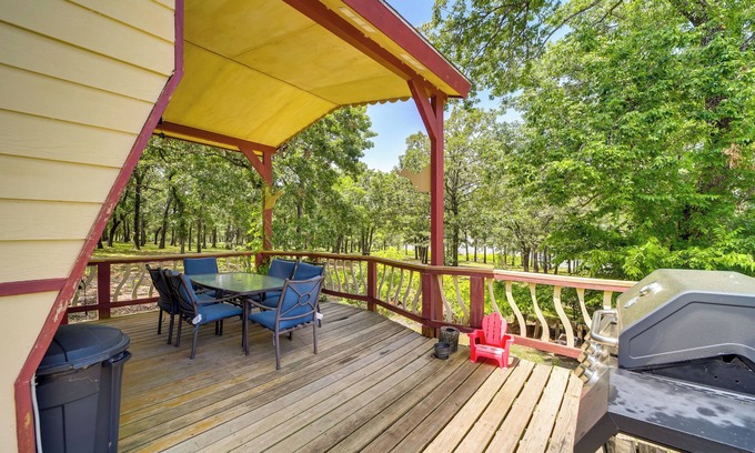 Featuring a furnished deck, a fire pit, and a full kitchen, this McAlester vacation rental is a true home away from home on Lake Eufaula! Unpack and settle into the 2-bedroom, 2-bath interior, then gear up to boat, swim, and fish on the water. Your crew will love relaxing amidst the tree-lined views while firing up the gas grill or gathering to play in the game room. Ready to switch up the scenery? Head out to explore Lake Arrowhead State Park or test your luck at Creek Nation Casino Eufaula!