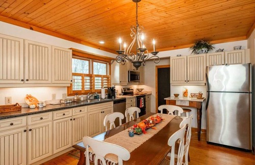 You'll immediately feel at home when you walk through the door at Cottage in the Clouds. The kitchen is fully stocked for preparing meals and boasts a large table for gathering. Through the kitchen is a large living space with comfortable furniture, smart TV, and a gas fireplace.