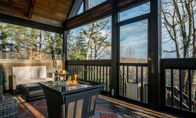 Enjoy a cup of coffee on the large screened-in porch which features comfortable furniture and a gas firepit. The coziness of the porch, rustling of the trees, and sound of the birds is so peaceful and relaxing—you'll never want to leave! There are steps off the porch that lead down to a space underneath the house with a gas grill if you feel like cooking out. If you're looking for a private, mountain getaway, this vacation home is for you!