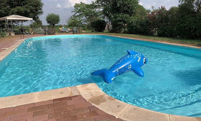 Nestled in the lush countryside of Pontecchio Polesine, this tranquil farmhouse offers a charming rural escape. Surrounded by a one-hectare park with fruit trees and open spaces, guests can relax on deckchairs, swim in the large pool, or enjoy tennis, ping pong, and foosball. A barbecue area and shaded seating make outdoor dining a pleasure, while children have ample space and play equipment to enjoy the countryside.