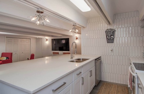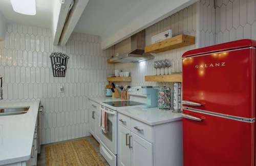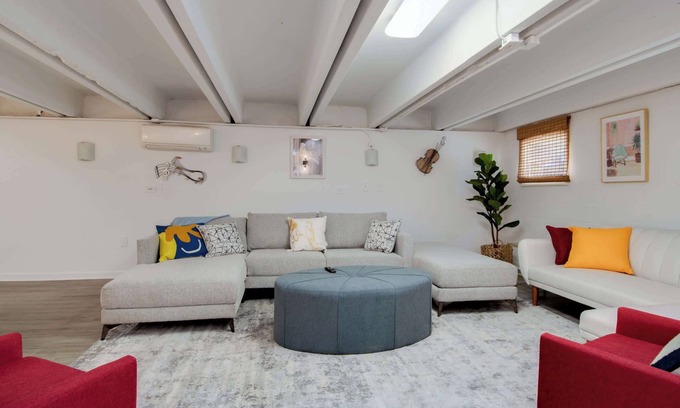 The living room is furnished with colorful furniture around a Smart TV (Netflix, Hulu, Disney+, etc). Steps away is the extended kitchen counter with counter stool seats. The kitchen is great for cooking homemade meals and is equipped with a toaster, Keurig coffee maker old-fashioned refrigerator and more.