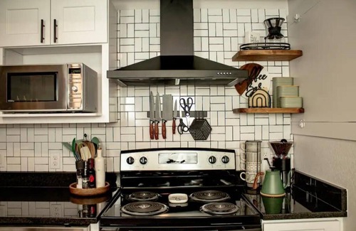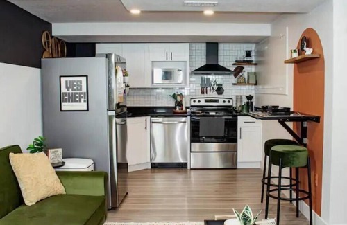 This basement apartment is freshly remodeled with a stylish mid mod boho theme. Featuring 91 ft. ceilings and 600 ft of living space, full bath, large rain shower, fully equipped kitchen, pour over coffee option, queen size bed and a single fold out couch for 1 additional guest. Guest have full private use of living space and quaint fully fenced backyard space accessible for you and your pup. (owner maintains and access trash through slight chance of guest interaction)