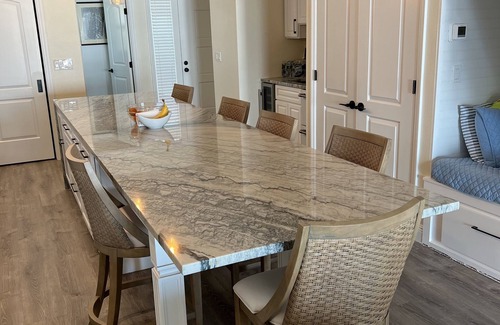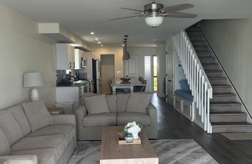 Two story, two bedroom beach townhouse (duplex), directly on the beach. I am working on new pictures. Kitchen features high end Cafe appliances, induction range with double oven, new cookware, 28 cu. ft french door refrigerator, wet bar with wine cooler and drawer refrigerator. 13 ft. island with seating for 6. New kitchen cabinets, granite countertops