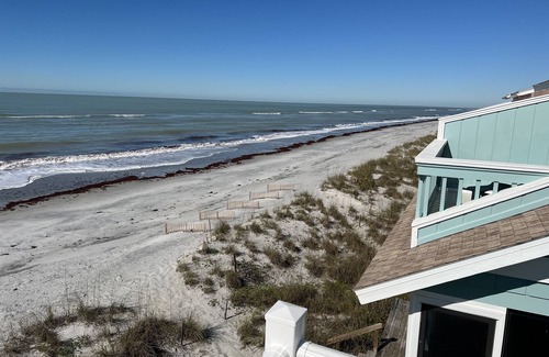 New LVP floors. Brand new master with walk in shower, double vanity,marble tile floors.Guest bath also brand new.No carpet anywhere in the house.Three different deck levels to view the ocean. Private Island with ferry access,( check for cost and hours https://palmislandtransit.com/ ) keeping the beach your own private sanctuary. This unit requires accidental damage coverage-its the $99 fee when you book, however, the rental includes 2 complimentary ferry passes to offset this cost. Your first trip on the ferry will be covered, simply give your name to the attendant, he will have a pass with your name on it, the second pass will be on the kitchen counter. Watch dolphin, fish, birds, turtles and manatee from your family room or decks. Screen deck on second level for enjoying the views bug free. Community pool that you rarely have to share.Unit includes2 paddle boards,2 kayaks, 6 beach chairs, umbrella and coolers.