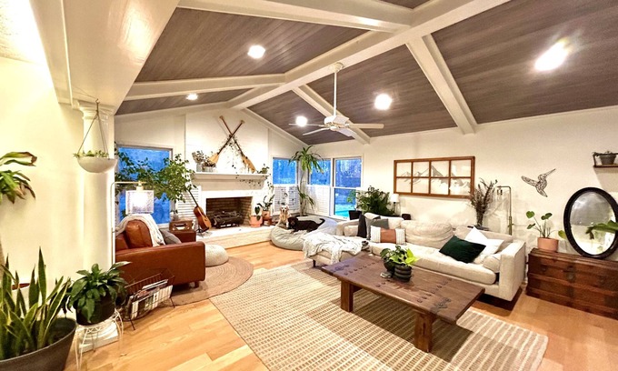 Big kitchen and breakfast table with large window filled with plants and bird feeders. Open dining room leads into a spacious living room with a fireplace and tons of books and plants. Primary bedroom is large with king bed and daybed/dog bed. Second bedroom has attached bath which also opens to the hall. Third bedroom has bunk beds- twin over full- and a futon. Outside features a pool and fenced pool deck, a fire pit with outdoor bar, a BBQ grill with unlimited propane, and plenty of parking.