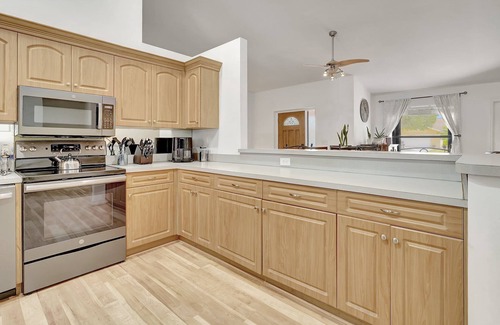 The outdoor space is the highlight of the home: a south-facing pool and spa, screened lanai, and covered patio with outdoor seating, TV, café lights, fans, and dining for six. Grill out with the combo pellet smoker + propane grill, soak up the sun, or enjoy peaceful evenings under the stars.