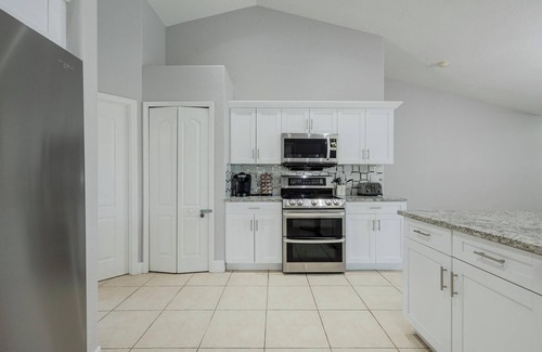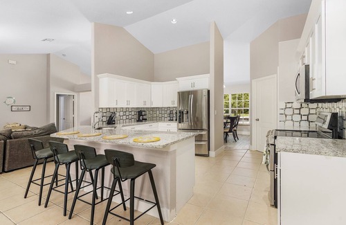 This freshly remodeled villa boasts a stunning 3,028 square feet with 6 bedrooms and 3 bathrooms. The moment you open the front door you will be immersed in paradise when you see your beautiful heated pool and closed in lanai area surrounded by palm trees! The patio area has your own table and chairs, along with a BBQ for cooking. The lanai is fully screened in, so there will be no worries about your bug friends invading your privacy during your stay! When you walk into the house from the pool, you will enter your brand new kitchen area with seats along the island to hang out! The kitchen is stocked with coffee machines and everything you need to cook during your stay! Your living room has a large couch with plenty of room for everyone along with a ROKU smart TV to stream all your favorite movies and shows (personal login credentials are required to stream). Your master bedroom on the first floor is equipped with its own bathroom and can access the pool deck area. Upstairs you will find the entire floor devoted to your second master bedroom, fully equipped with its own bathroom and plenty of privacy. 2 of the guest bedrooms are equipped with 2 full size beds in each. 1 of the guest bedrooms is equipped with a queen bed. The last guest bedroom has a queen bed with amazing canal views! Both Master bedrooms are equipped with their own ROKU smart TV's. Creating a relaxing and fun vacation full of memories for our guests is very important to us, and this villa is set up for you to do just that!