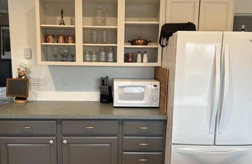 Full size stocked kitchen and bathroom compliments this comfortable country studio apartment. Bed can be a king OR 2 twins for versatility for our guests as well as a queen size sofa bed, perfect for a small family or 3 adults. This is an open space studio, the only door/closed space is the bathroom. Unit offers blinds in all windows to give full privacy. Enjoy the outdoor patio, complete with BBQ, a pond view and garden are all part of the experience. Dog, cats, goats, chicken, geese, turkeys, pigs and cows all call this place home with our 4 children.