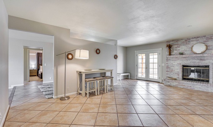 A living room, a fireplace, air conditioning, and a ceiling fan are featured at this 4-bedroom, 2-bathroom rental. The kitchen is equipped with an oven, a stovetop, and a dishwasher, as well as paper towels.