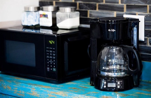 KITCHEN: Features mini oven, plenty of counter space, a sink (no dishwasher), a fridge, coffeemaker. The kitchen is equipped with all the basics to cook a full meal, as well as 2 place settings. Coffee, creamer and sweeteners. A charcoal grill is also provided outside for guest use.