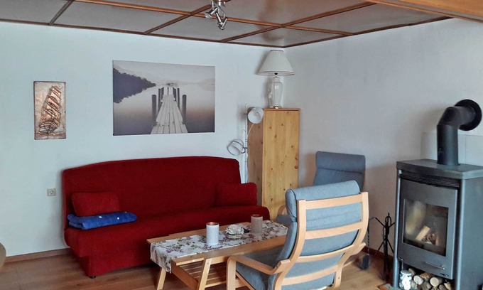 The approximately 60 square meters large Non smoking cottage has a living room with fireplace (sofa bed & # 150; extra bed for one person, flat screen TV), a bedroom (double bed, a single bed), an open kitchen (electric stove with oven, refrigerator with freezer, microwave, dishwasher, coffee maker, kettle, toaster), a small hallway and a bathroom with shower, toilet and hair dryer. Furthermore, there are a terrace directly from the entrance, another sitting area next to the house, space in the garden, Fahrradabstell- and garaging, parking, barbecue, insect screens on the windows, night storage heaters, a firewood, free Wi-Fi and on request a highchair available.